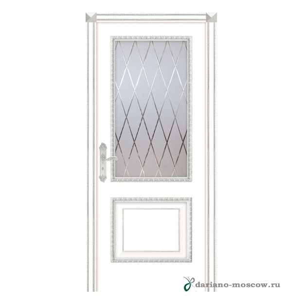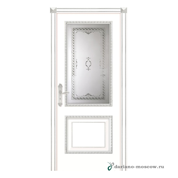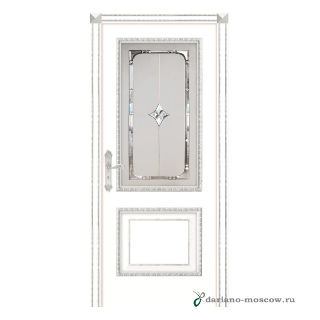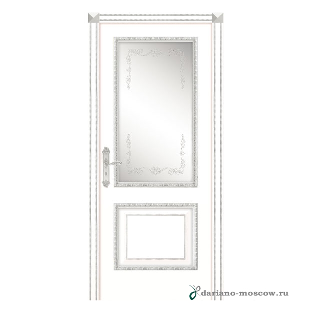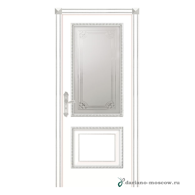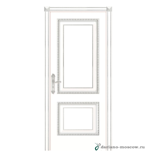 Багетная серия Дариано. Дверное полотно изготовлено из наборного массива сосны. В качестве отделки используется эмаль белая с серебром.